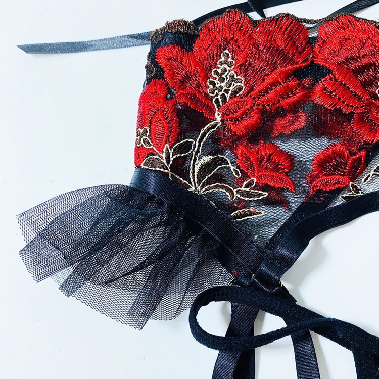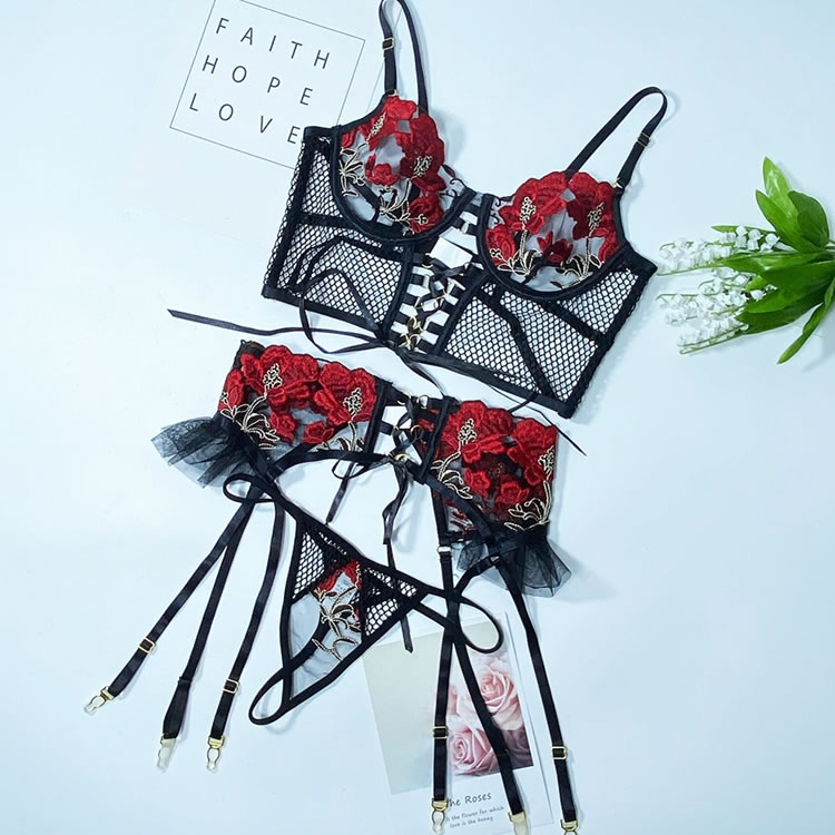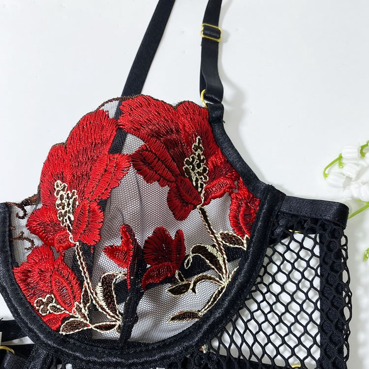 This sexy black bra set features sheer lace underwire cups, a sheer fishnet underbust band with criss-cross lace-up details, adjustable spaghetti straps, a hook and eye back closure, high waisted garter belt with adjustable garter straps, and a matching thong panty.