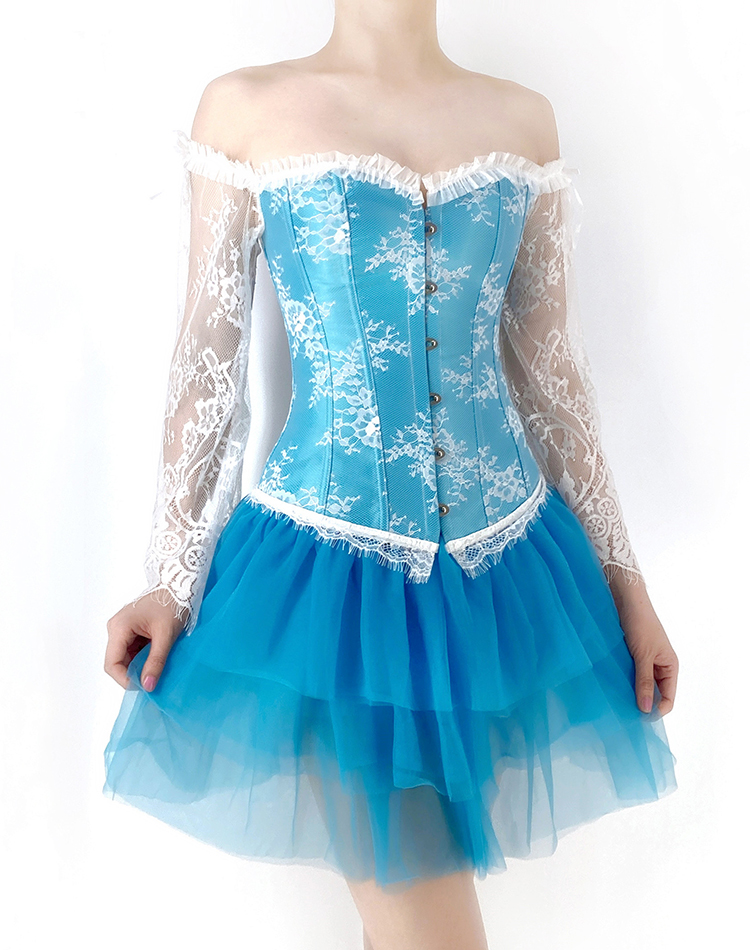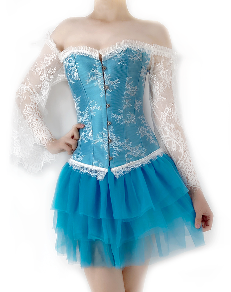 Off shoulder corset featuring long sleeves, front busk closure, lace-up back, and a matching mini tutu skirt.