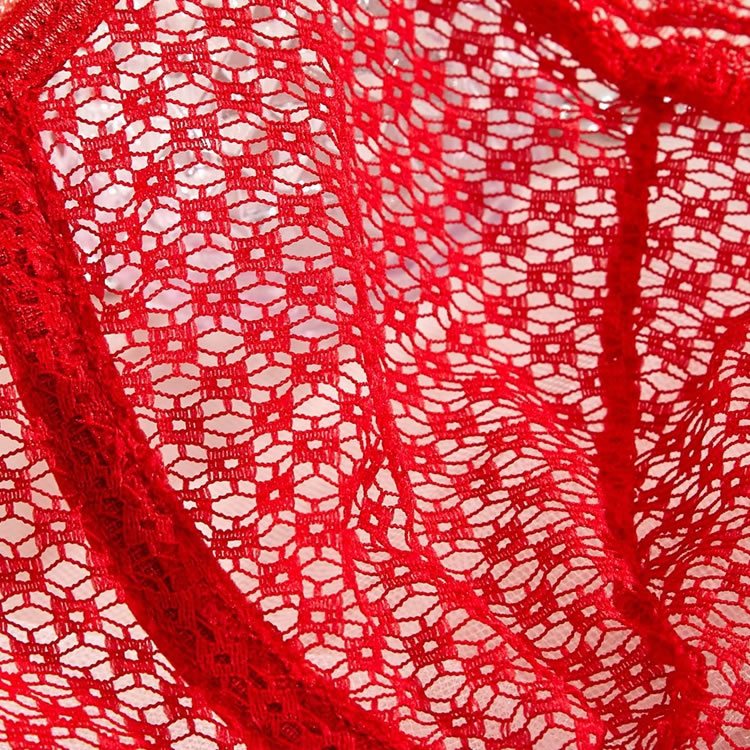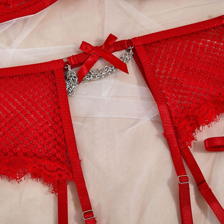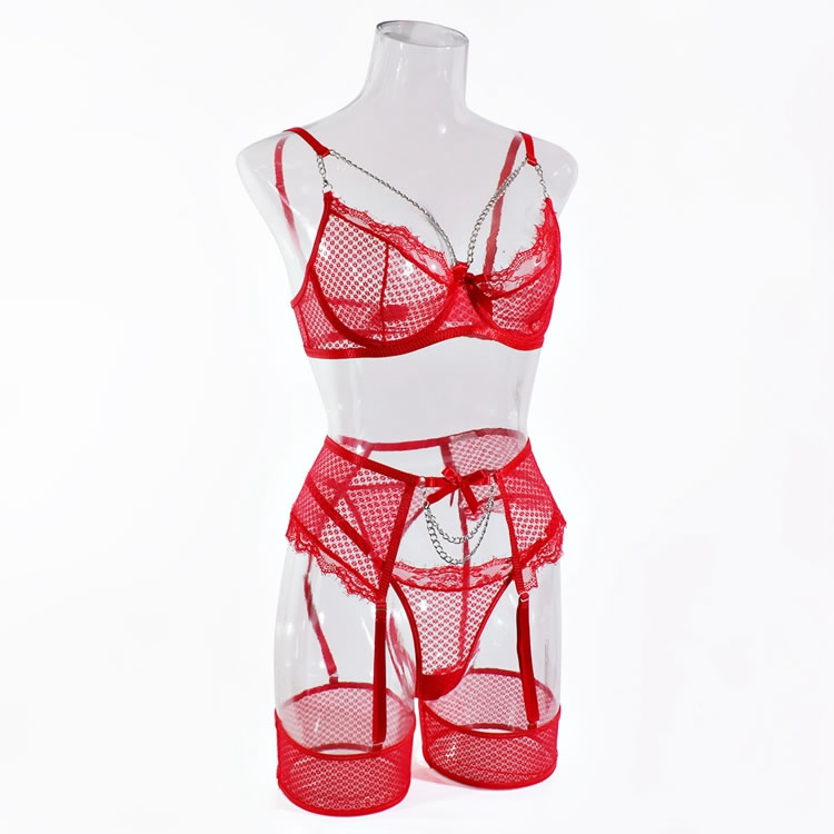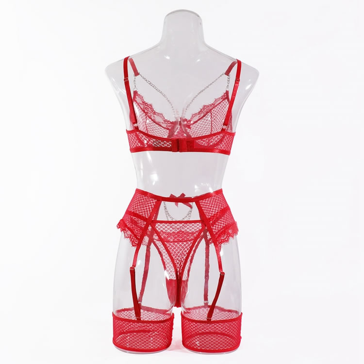 Add a sensual touch to your bedtime wardrobe with this flirty bra set featuring sheer lace underwire cups with a chain detail, adjustable spaghetti straps, a hook and eye back closures, a matching garter belt with adjustable garter straps, Wraparound Leg Garters, and a matching panty with a thong cut back.