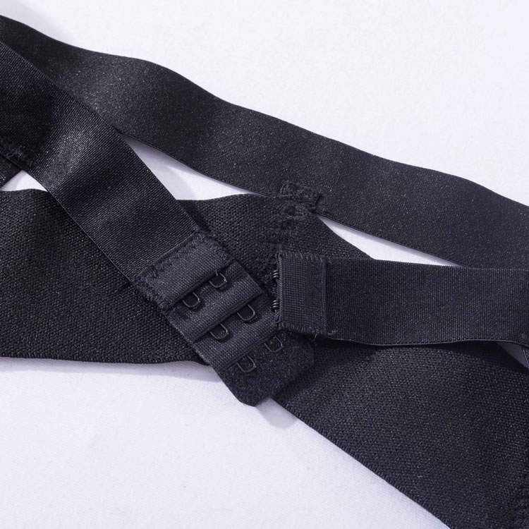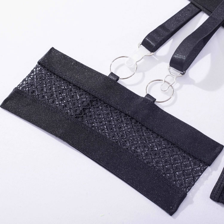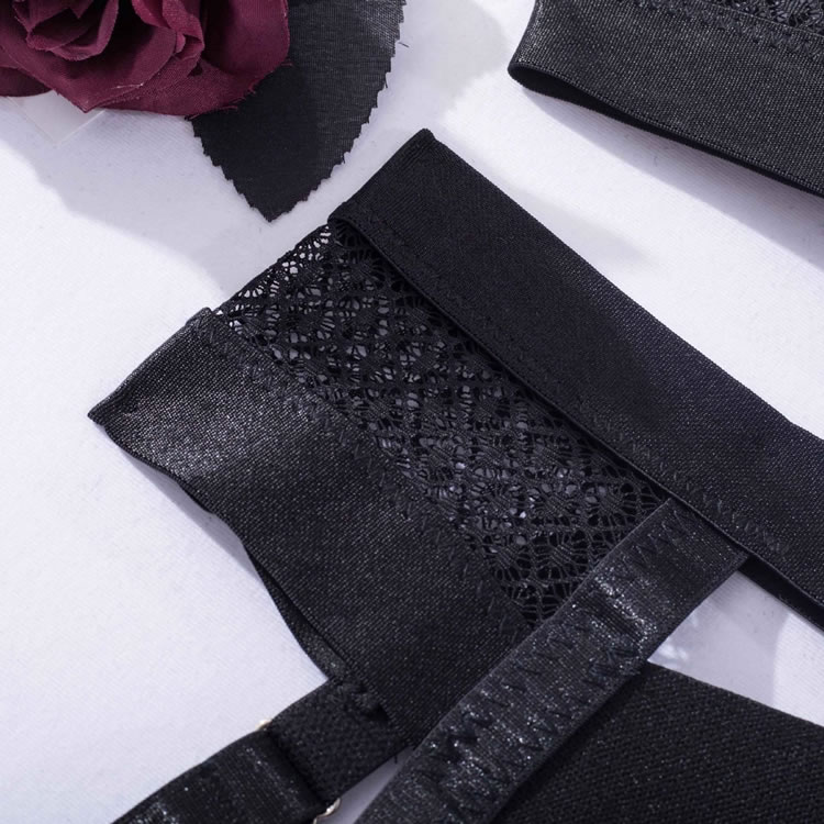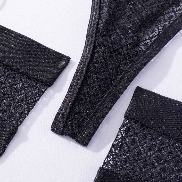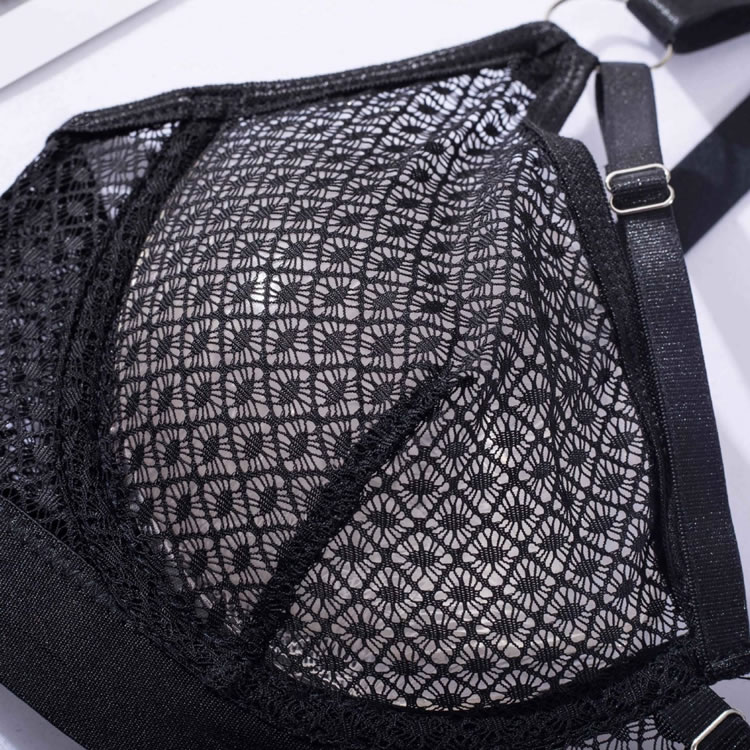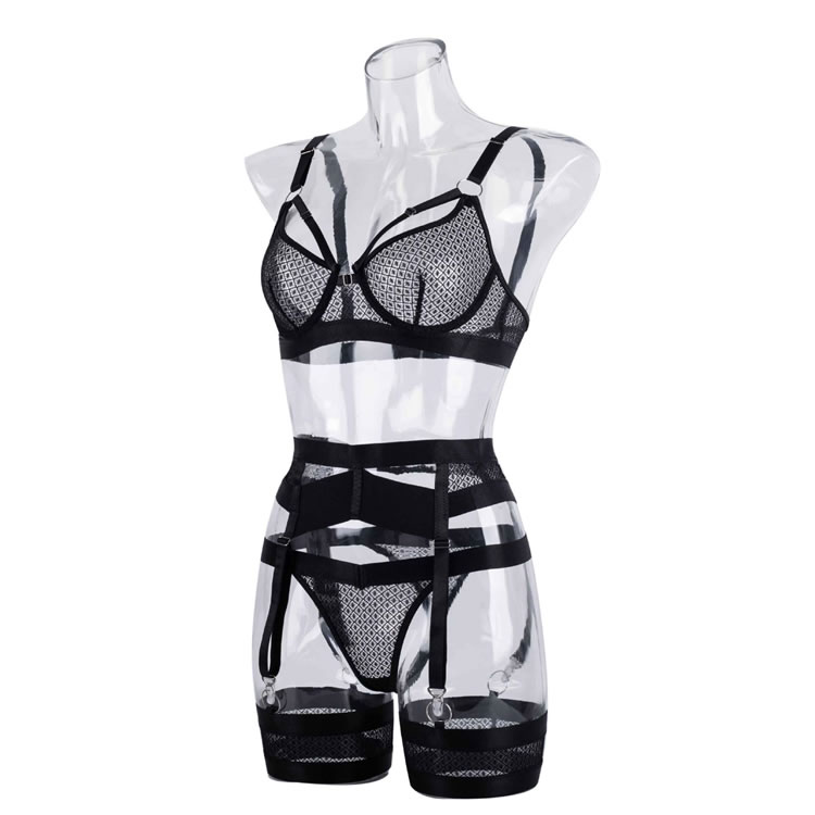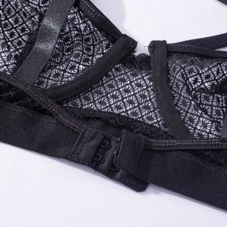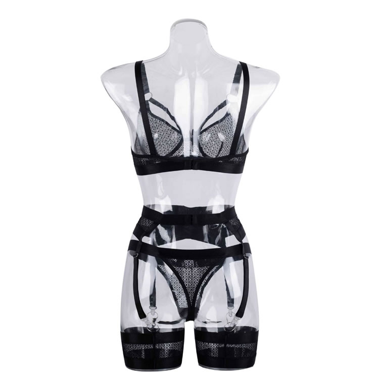 Dominate your babe in this spicy bra set featuring sheer mesh underwire cups with strappy bust detailing, adjustable shoulder straps, a hook and eye back closure, a matching garter belt with djustable garter straps, wraparound leg garters, and matching panty with a thong cut back.