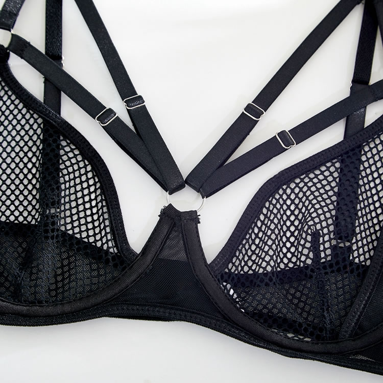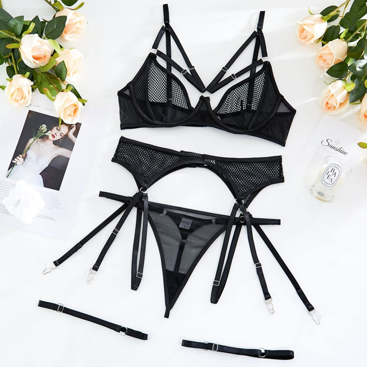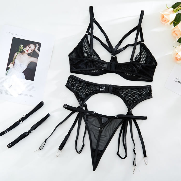 Do you dare tease to please? Bring bad girl touches to your boudoir with this exclusive bra set featuring sheer underwire cups with strappy detailing, adjustable spaghetti straps, a hook and eye back closure, a matching garter belt with with adjustable garter straps, wraparound leg garters, and a matching panty.