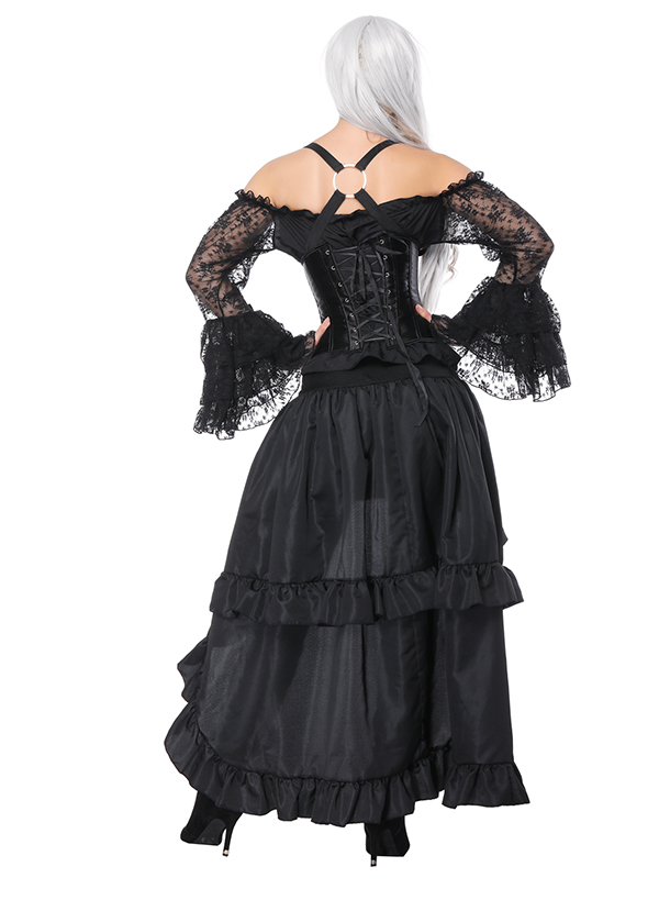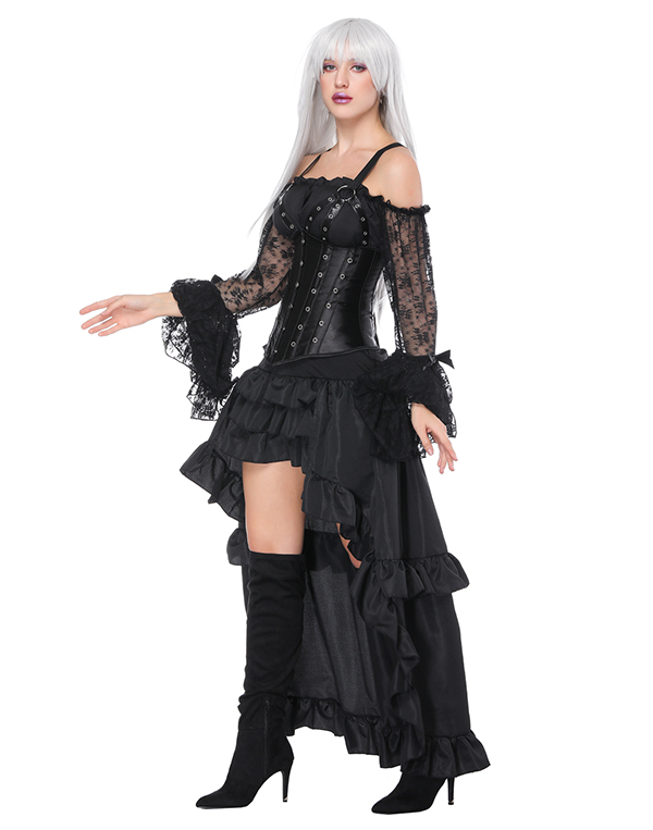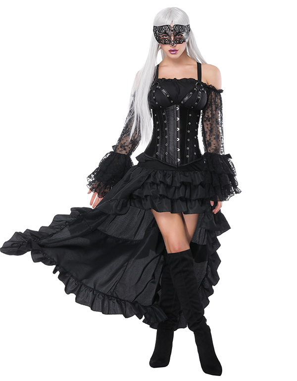 This corset featured a sweetheart neckline with criss-cross detailing, steel busk front closure, and a lace-up back closure, and a matching high low skirt.